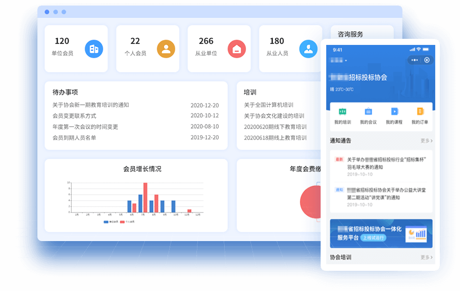 安訊協(xié)會一體化服務平臺,是按照“互聯網+社會組織”的理念,采用 “云計算、大數據”等先進信息技術,立足協(xié)會服務會員、規(guī)范市場秩序、開展行業(yè)自律等需求,建立的一體化管理與服務平臺,集成會員、從業(yè)人員、從業(yè)單位管理,通知、培訓、會議、咨詢、資源、直播服務,以及門戶網站、移動應用,實現協(xié)會各業(yè)務數字化整合,全面提升各方獲得感,為協(xié)會服務國家、社會、行業(yè)提供全面的信息化支撐。